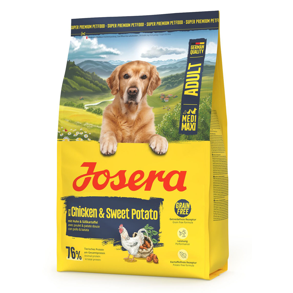 Josera Medi/Maxi Chicken & Sweet Potato ist das gut verträgliche, kartoffelfreie Hundefutter für aktive Vierbeiner mittlerer und großer Rassen. Die getreidefreie Rezeptur mit Süßkartoffel und leckerem Huhn sowie diätetischen Fasern zeichnet sich durch ihre besonders gute Verdaulichkeit aus. Vitamin E und L-Carnitin liefern aktiven Naturliebhabern auf vier Pfoten ein Plus an Energie.
