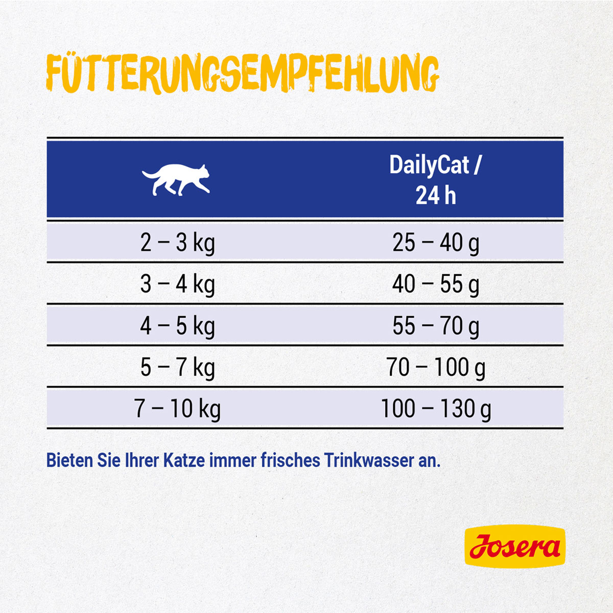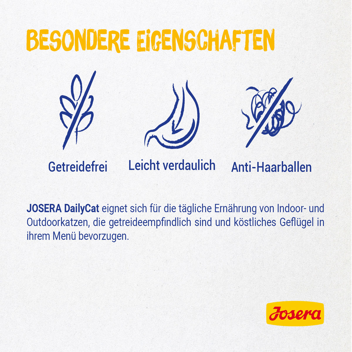 Josera DailyCat eignet sich für die tägliche Ernährung von Indoor- und Outdoorkatzen, die getreideempfindlich sind und köstliches Geflügel in ihrem Menü bevorzugen.