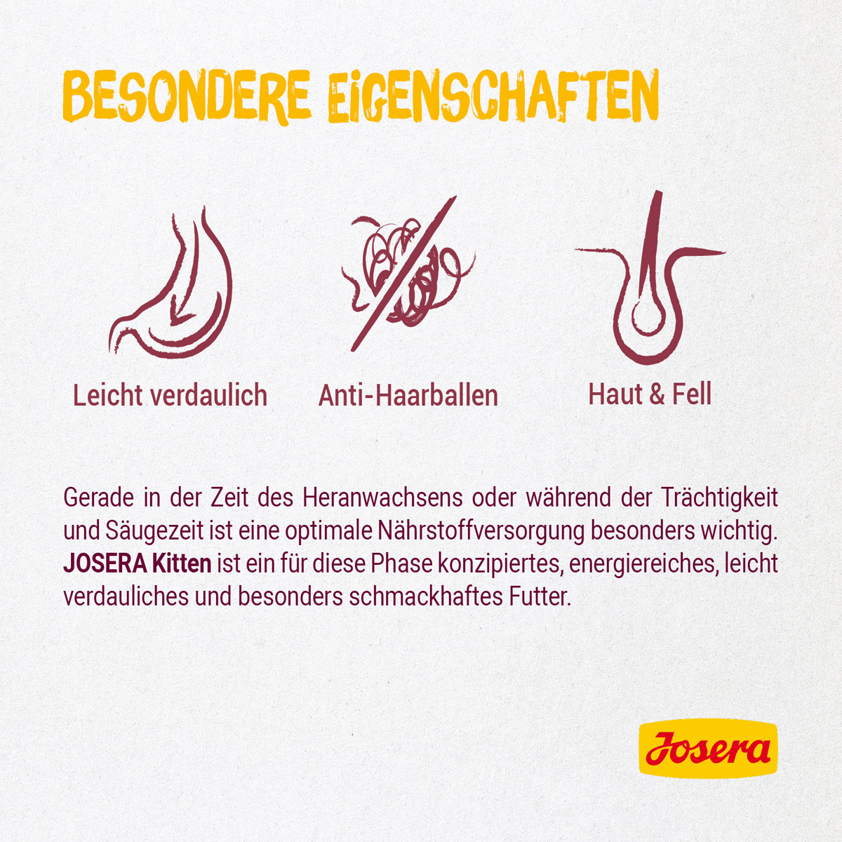Gerade in der Zeit des Heranwachsens oder während der Trächtigkeit und Säugezeit ist eine optimale Nährstoffversorgung besonders wichtig. Josera Kitten ist ein für diese Phase konzipiertes, energiereiches, leicht verdauliches und besonders schmackhaftes Futter, das den kleinen Kitten genauso gut schmeckt wie der Katzenmama.