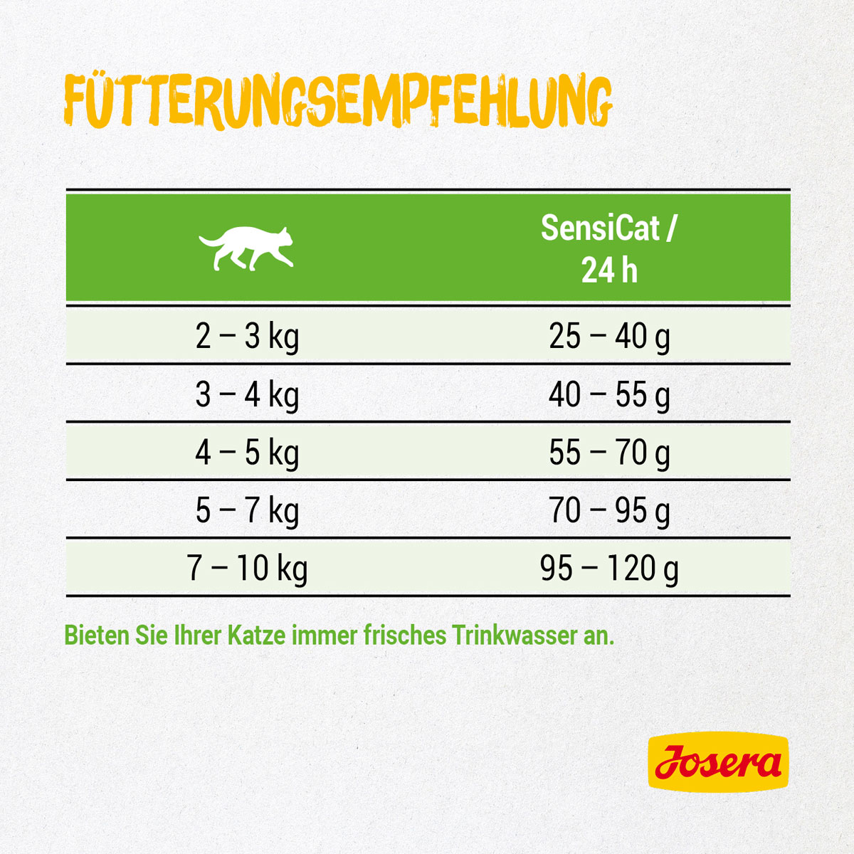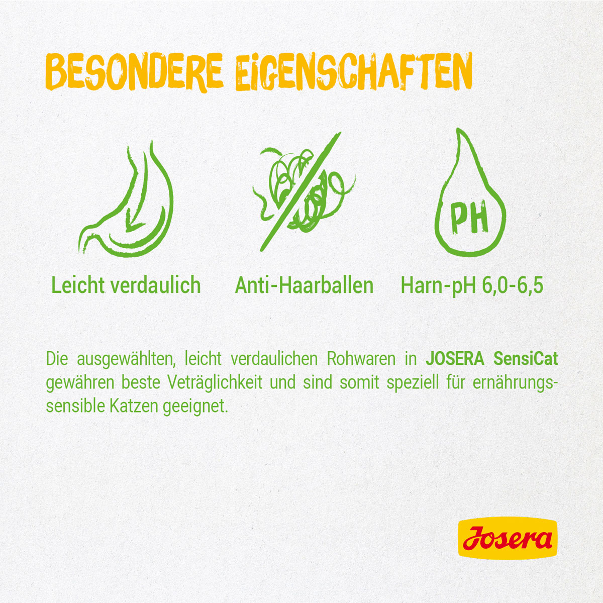 Grummeln und Knurren im Katzenmagen? Wir haben ein Menü, bei dem das der Vergangenheit angehören wird: Unser Josera SensiCat beinhaltet nur ausgewählte, leicht verdauliche Zutaten und ist somit besonders verträglich. So kommen auch ernährungssensible Samtpfoten in den Genuss eines echten Gourmet-Menüs!